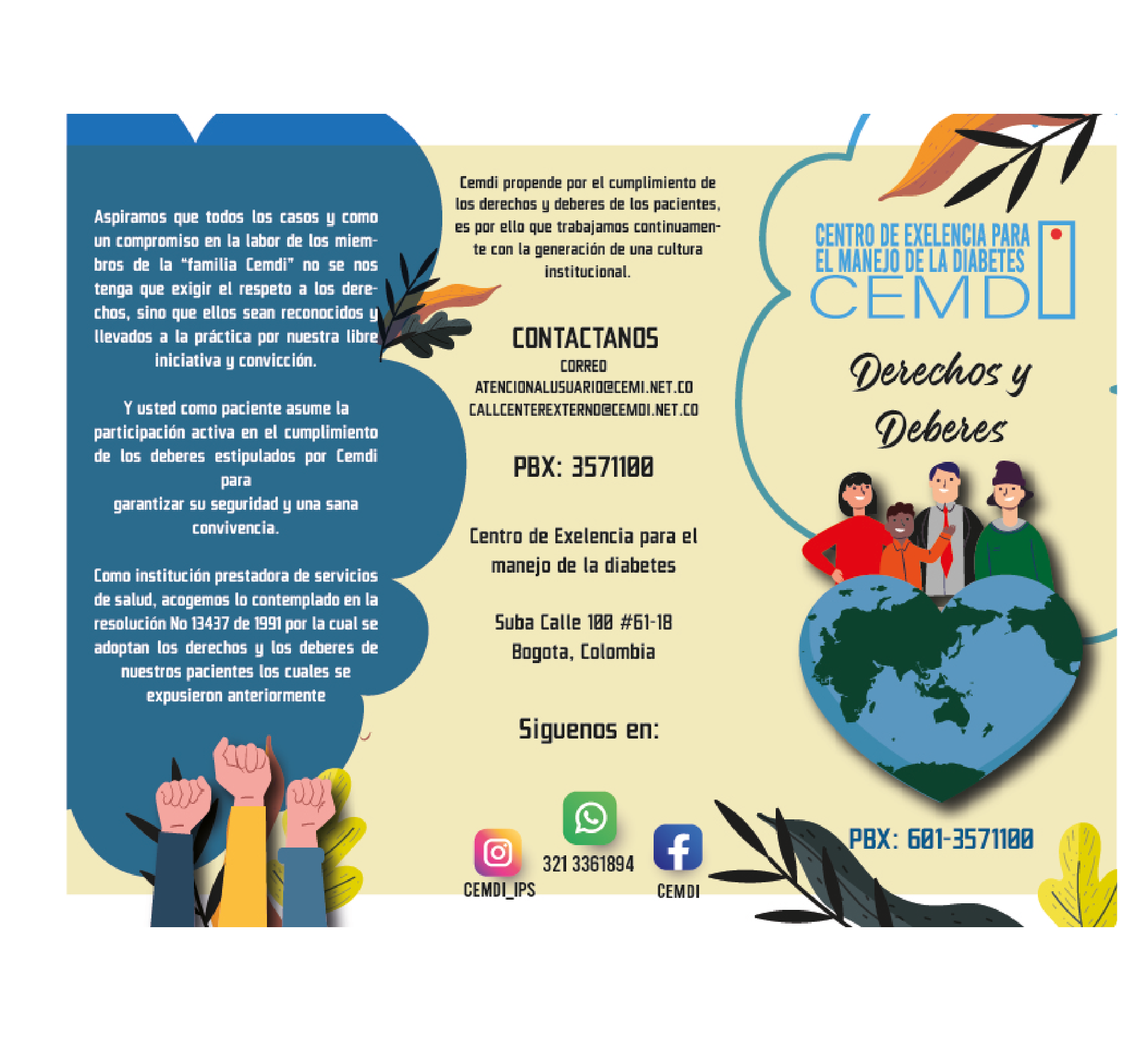 INICIO QUIENES SOMOS SERVICIOS BLOG NOVEDADES GALERIA CONTACTO BLOG ASISTENCIA TELEFONICA Call Center : 601-7940220 SOLICITUD DE CITAS Y PQRS Agendamientoscemdi@arcos.com.co atencioalusuario@cemdi.co SOLICITUDES JUDICIALES gerencia@cemdi.net.co ASISTENCIA VIRTUAL WHASTAPP: 322 718 3852